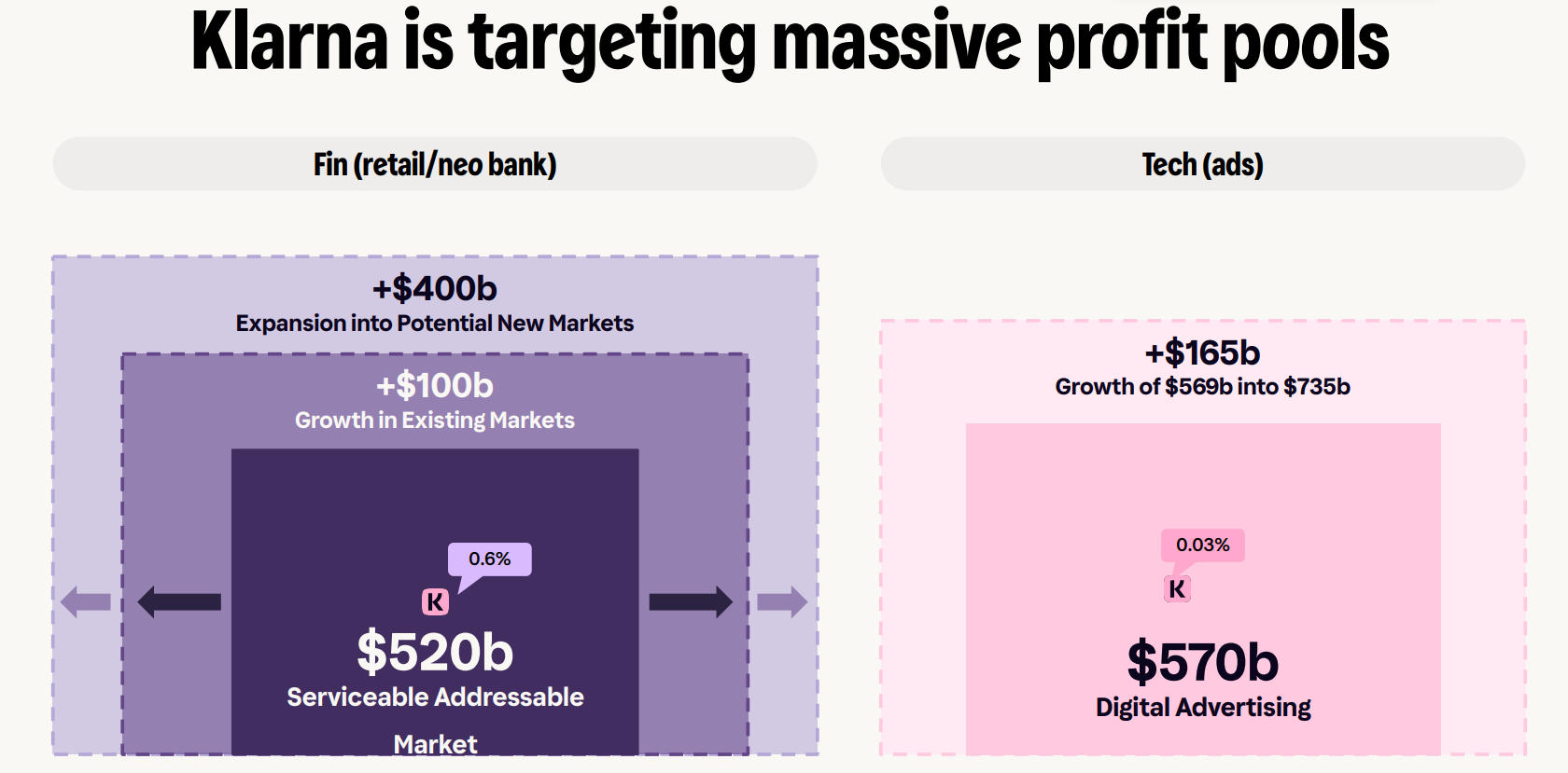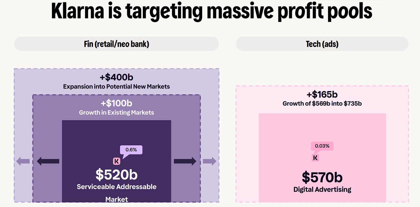 The revenue streams above reinforce my view of Klarna trying to be there every day, everywhere, and across everything. At its core, Klarna is pushing into three large markets simultaneously: commerce through retail merchants, consumer neobanking, and technology-enabled advertising. Beyond the fast-growing BNPL category, each of these markets is large in its own right and offers a long runway for growth.