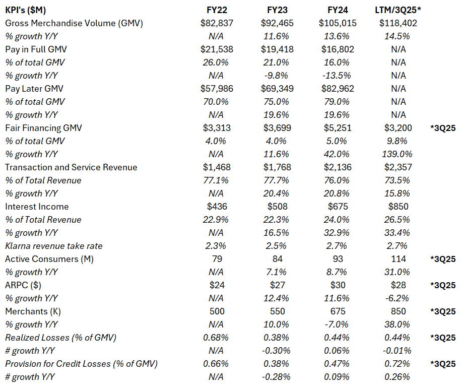 Across all revenue streams, Klarna generated $3.2B in LTM-3Q25 revenue. On a GMV basis, this implies a consolidated take rate of ~2.71%, up ~41bps over the past three years.