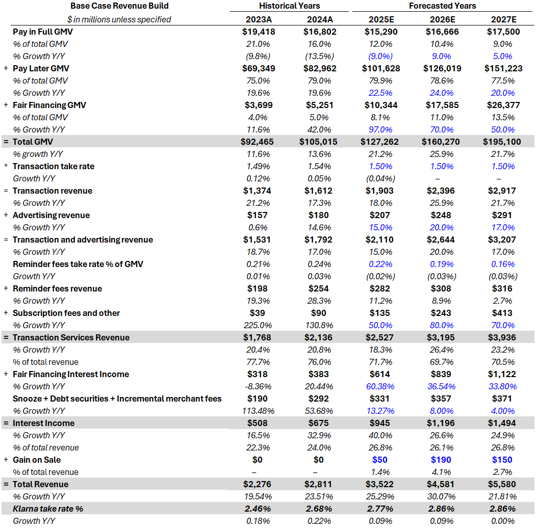 2026 is where the model inflects. Total GMV is projected to grow 25.9% Y/Y to $160.3B, driven primarily by Fair Financing mix expansion and continued Pay Later momentum, with Pay in Full stabilizing on easier comps. The model assumes ~$33B of incremental GMV in 2026, supported by multiple overlapping tailwinds: consumer-led GMV from Klarna Card adoption, rising BNPL awareness, Apple Pay and Google Pay integrations ramping, and merchant-led GMV from direct merchant wins, default-on PSP expansion across Stripe, JPM, Worldpay, and others. A stimulated U.S. consumer and macro support in the EU, including ECB rate cuts and fiscal easing in Germany, provides an additional lift.