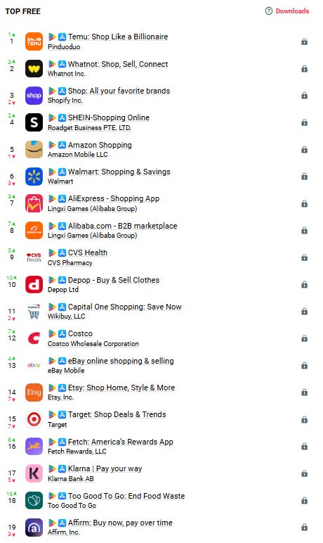 App rankings. As of today, the Klarna app ranks 17th among the most downloaded shopping apps in the U.S. During the peak of the holiday shopping season, it ranked 8th. Worldwide, it ranks 23rd.