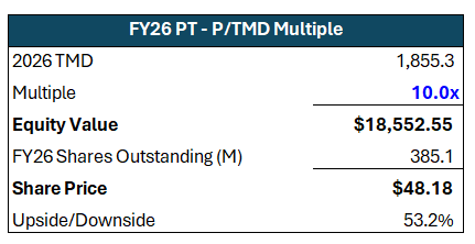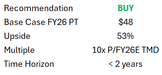 If the base case plays out, I see KLAR maintaining its ~10x LTM P/TMD on FY26E TMD, equivalent to expanding its current P/FY26E multiple by ~3.7x turns, still ~3.8x turns below AFRM. A 10x FY26E TMD multiple implies a $48.18 price target, or ~53% upside, which I believe is achievable within ~18 months.