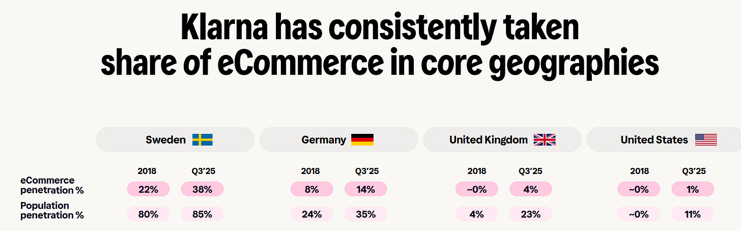 Klarna is the leader in the global BNPL market, with an estimated ~30% share of global BNPL e-commerce volumes in 2024. Despite rising competition, Klarna has continued to take share, with total global e-commerce penetration now in the ~1.5–2% range.