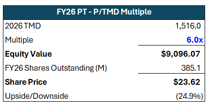 Taken together, the P14 base case projects transaction margin dollars of $1.264B in FY25, effectively in line with management’s $1.261B guide. Based on the drivers above, I project 460bps of transaction margin expansion in FY26 to 40.5%, followed by 90bps of expansion in FY27 to 41.4%. These estimates may prove conservative with scaling advertising and subscription revenues, which are essentially pure-margin revenue sources.
