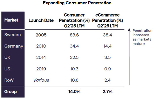 Following the grant of an EU banking license in 2017, Klarna expanded into neobanking services that support its long-term platform strategy. These include bank accounts, savings products, Klarna Balance, and budgeting tools. While not always direct revenue drivers, they play a critical role in funding and retention. As of 3Q25, Klarna held ~$14B in consumer deposits, which funded over 90% of lending activity in the twelve months ended September 30, 2025. The majority of deposits originate in European markets where Klarna operates as a licensed bank.
