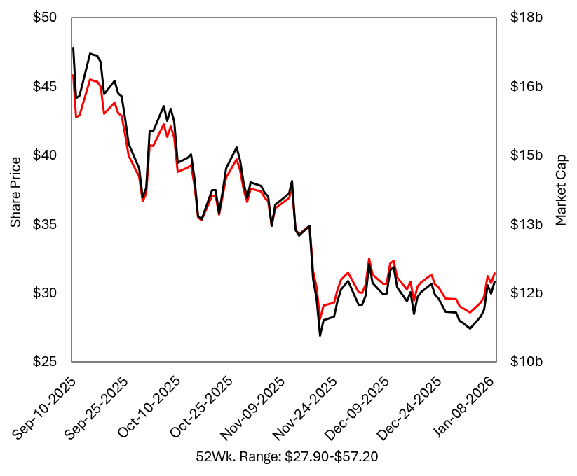 KLAR is a market leader in a growing category that is expanding into more lucrative products while benefiting from both merchant-led and consumer-led GMV growth. The risk/reward is attractive, with substantial upside optionality as the business approaches a clear inflection point for both top-line growth and margins in 2026. P14 currently holds a 7.4% position at an average cost of $30.67/share and intends to build this toward a 10% weight. While this is a high-conviction position for me, given ongoing industry skepticism, the market’s tendency to quickly lose interest in fintech, and the non-fundamental factors discussed above, I recognize that KLAR is a long that will likely require active trading along the way.