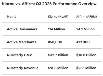 While Klarna leads globally, Affirm still holds a higher share of U.S. e-commerce, at ~1.4% versus Klarna’s ~0.9%. That gap is closing quickly. Klarna’s U.S. revenue grew 51% in 3Q25, and U.S. Fair Financing volume surged 244% following recent enterprise wins with Walmart and eBay.
