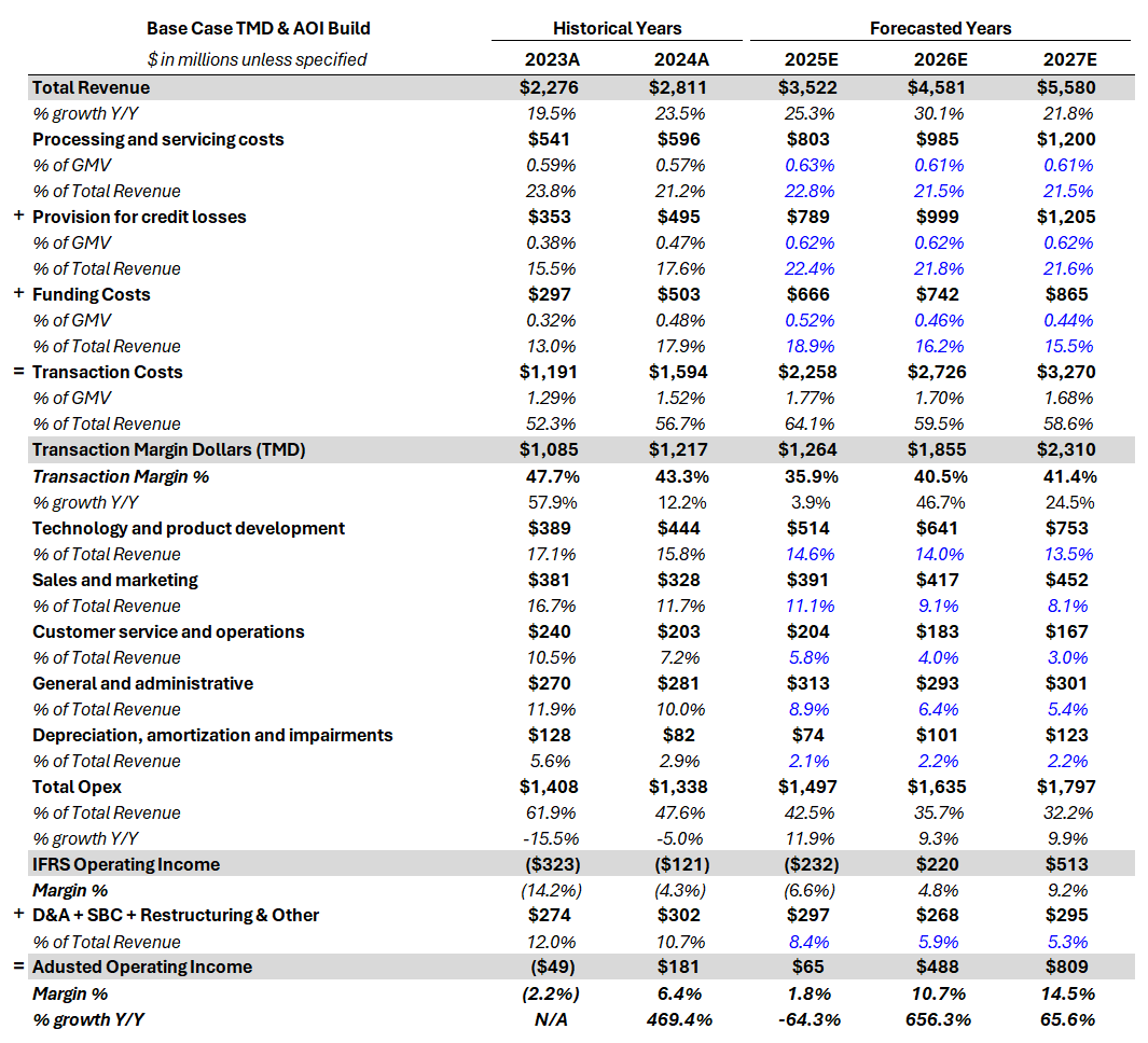 The top-line picture for KLAR is attractive, but the key reason the stock trades at a steep discount to peer AFRM is the market’s skepticism around margins (along with other non-fundamental factors). As such, medium-term upside depends on a clear and credible path toward margin expansion over the next two years. I break this down into transaction margin drivers and adjusted operating income drivers.