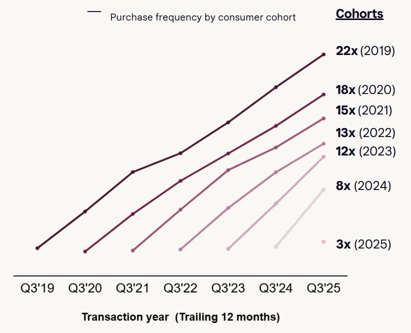 Unlike AFRM, which has long operated a scaled term-loan product, Klarna is still early in its Fair Financing ramp. That ramp is only accelerating. Merchants using Fair Financing increased 87.5% Y/Y to ~150K in 3Q25. Importantly, unlike Pay Later, Fair Financing requires explicit merchant enablement rather than the default PSP activation, making this uptake a signal of organic demand rather than passive adoption.