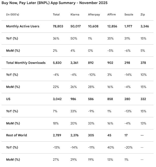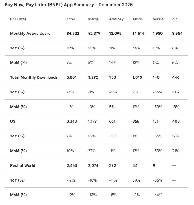 U.S. monthly downloads. Klarna’s 2025 relaunch of its debit-first card drove a sharp spike in U.S. downloads, with ~1M downloads in just 11 weeks, as the app is required to manage card and banking features. November 2025 U.S. downloads were up 33% Y/Y and 20% MoM for KLAR versus 1% Y/Y and 16% MoM for AFRM. In December 2025, KLAR U.S. downloads rose 52% Y/Y and 22% MoM to ~1.2M, versus AFRM at 1% Y/Y and 13% MoM to ~0.97M.