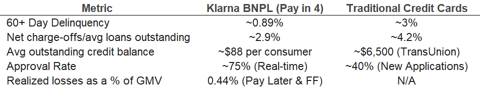 Unlike traditional credit cards that extend a revolving line of credit, BNPL origination is transaction-led and underwritten in real time at the SKU level using transaction context, merchant data, consumer behavior, and historical repayment patterns, rather than relying primarily on FICO scores or static credit limits. Combined with a shorter average loan duration of ~40 days at Klarna, this structure allows BNPL issuers to adjust approval standards dynamically as conditions change, structurally capping loss severity relative to credit cards, whose balances typically revolve for far longer.