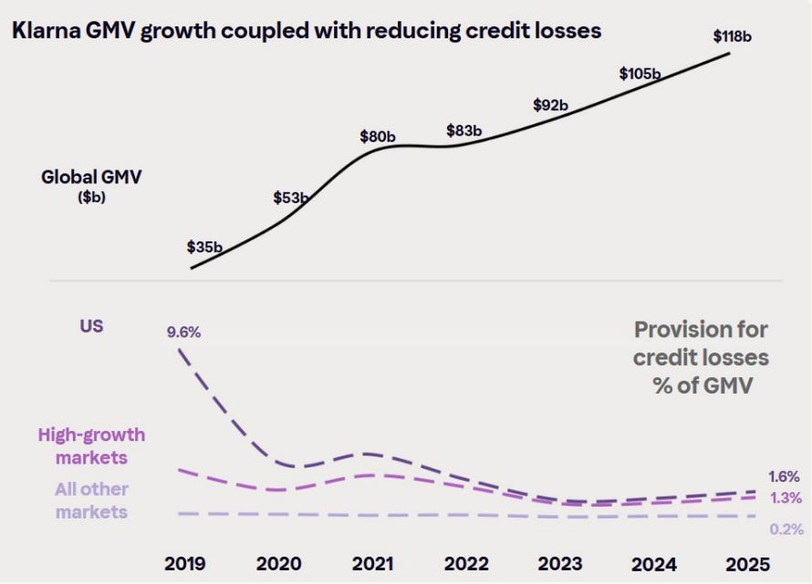 A test of the times - a 50% spike in default rates in 1Q26? With BNPL usage growing strongly during the 2025 holiday shopping season, there has been some online speculation suggesting that “BNPL default rates could surge as much as 50% in the first quarter of 2026.” This would certainly be a risk if true; however, given the liquidity on Klarna’s balance sheet, the company should be well protected from a near-term worst-case outcome. Moreover, I doubt this speculation reflects the actual data or the strength of Klarna’s underwriting. In fact, KLAR is seeing credit losses trend down.