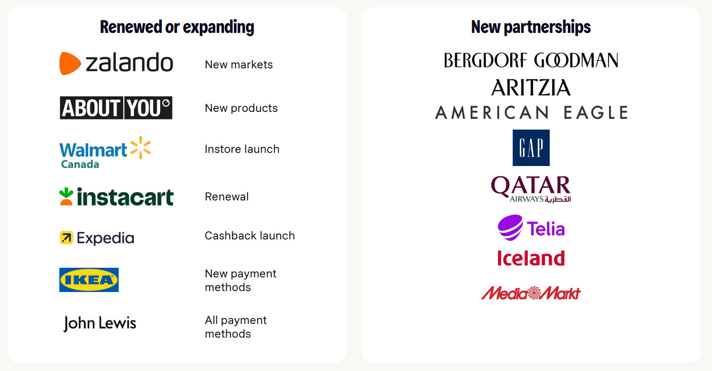 The second distribution channel is direct merchant integration, which defined Klarna’s early expansion. The company’s first major European win was ASOS between 2013 and 2016, followed by Urban Outfitters in the U.S. in 2015. Since then, Klarna has continued to secure large enterprise relationships across global retail, including Nike, Airbnb, DoorDash, and most recently Walmart. Direct integrations account for the remaining ~50% of GMV and generally offer superior per-transaction economics relative to PSPs, while PSPs provide a low-CAC, one-to-many distribution channel. Klarna’s strategy deliberately balances both, pairing deep integrations with retail leaders and broad PSP-driven reach. Over the 12 months ended June 30, 2025, more than 142,000 new consumers tried Klarna each day through merchant websites, showcasing the sheer scale of this distribution strategy.