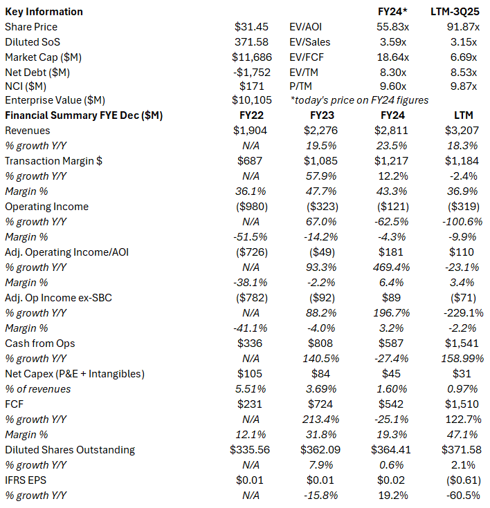 Operating leverage is inherent in the business model with transaction volumes scaling at low incremental cost, while opex discipline and automation drive margin expansion. Transaction margins have increased 84bps from FY22 to 36.9% in the LTM, with a peak of 47.7% in 2023. Adjusted operating margins have expanded 4,156bps from FY22 to 3.4% in the LTM, reaching a peak of 6.4% in 2024. The lumpiness of these margins will be addressed in greater detail in the margin thesis section of this report.