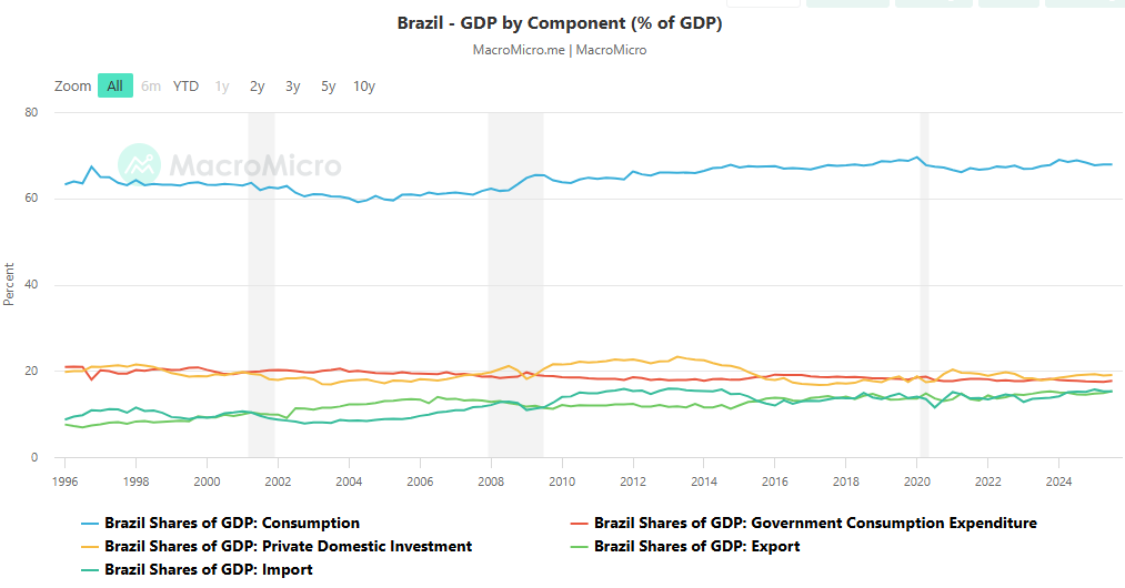 It is often a misconception that Brazil is an export-driven economy. Naturally, a declining dollar is perceived to benefit commodity currencies the most, and Brazil is often grouped with export-oriented economies. While exports are an important component, with Brazil being a resource-rich country, the economy is fundamentally domestically driven, anchored by a large services sector, alongside a globally important commodity and agribusiness complex. Services consistently account for ~60–70% of total GDP and employ over 70% of the workforce.