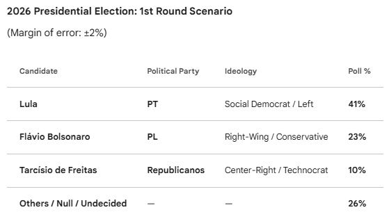 As it stands today, Lula is comfortably in the lead. The most recent polling for the October 2026 election from the Genial/Quaest survey, released earlier this week, reflects that.