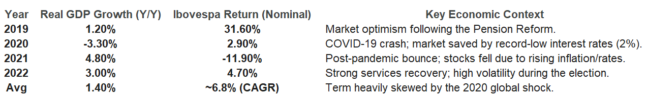 The Bovespa has risen ~44% in BRL terms. 2024 delivered a -10.4% return as markets grappled with high interest rates and fiscal concerns. 2025 has seen a strong rebound driven by foreign inflows and the debasement trade, despite the Selic reaching 2-decade highs. Real GDP growth has averaged ~3%, assuming the +2.3% 2025 estimate holds, with growth slowing in 2025 due to high real rates.