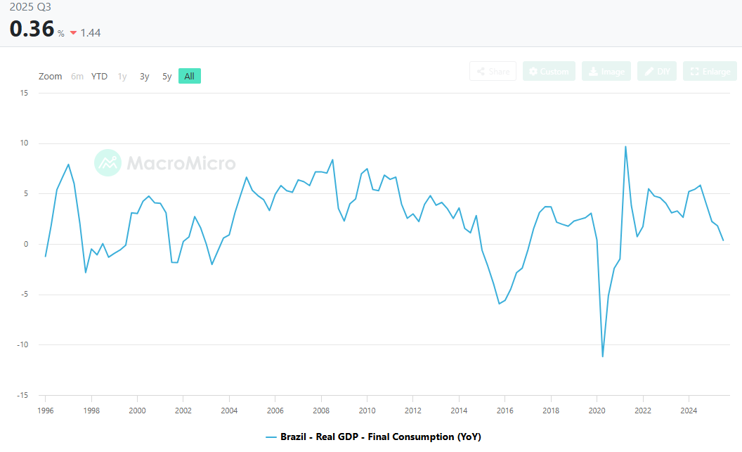 Brazil is a consumption-driven economy, with consumption accounting for 67.82% of GDP. While its share of real GDP has remained in the 60s since 1996, consumption’s contribution to growth has weakened materially since real GDP growth began decelerating post 3Q24. In 3Q25, consumption contributed 0.24pp to 1.82% Y/Y GDP growth, compared to a 1.22pp contribution to 2Q25’s +2.36% Y/Y growth. Consumption growth has decelerated from +5.83% Y/Y in 3Q24 to just +0.36% Y/Y in 3Q25.
