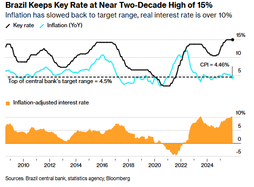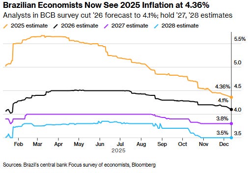Brazil now has one of the highest real interest rates in the world. One could argue the BCB has overcorrected in response to inflation, reflecting PTSD from the post-COVID inflation peak near 12% in 2022. More recently, inflation rose to ~5.5% before easing. Brazil’s formal inflation target is 3%, with a ±1.5pp tolerance band. The November CPI reading of 4.46% brought inflation back within the BCB’s target range for the first time in 14 months. Despite this, the BCB maintained a cautious stance at its 12/10 meeting, holding rates unchanged and offering no explicit forward guidance.