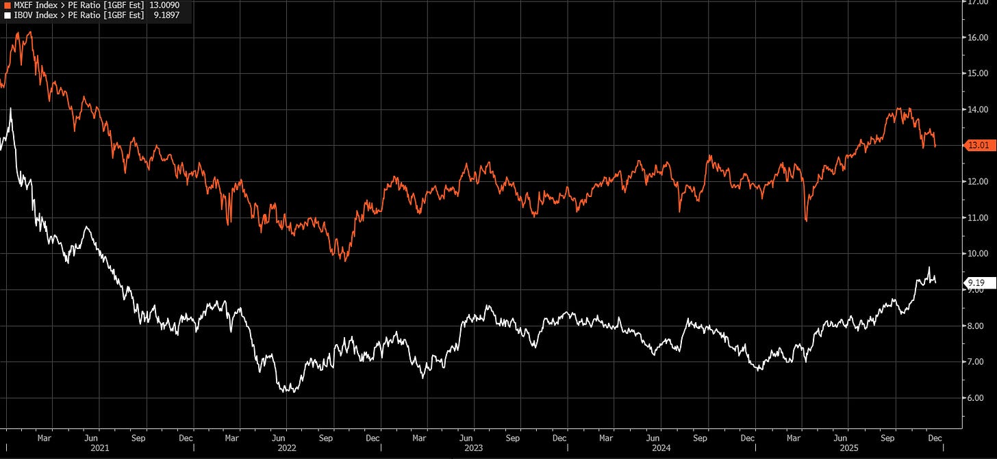 I believe Brazilian equities are positioned to deliver superior returns over the next few years relative to the S&P 500, with the valuation gap vs. other emerging markets set to narrow. In my view, Brazil is approaching an inflection point where the macro stars are beginning to align, with the debasement trade continuing alongside monetary easing and political optionality, setting the stage for incremental foreign inflows, a recovering consumer as borrowing costs fall, and upside from a more pro-business outcome if the right wins in 2026.