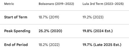 In fact, compared to the 3 presidents who served between Lula’s 2nd and 3rd terms, Lula’s Brazil has materially outpaced all 3 on average GDP growth. Rousseff (2011–2016), left-wing, averaged -0.5% GDP growth. Temer (2016–2018), centrist, averaged +1.3%. Bolsonaro (2019–2022), right-wing, averaged ~+1.4%, though Bolsonaro’s term was heavily muddled by COVID.